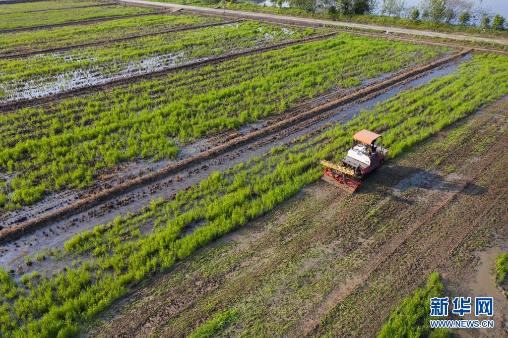 4月5日,浙江紹興諸暨市次塢鎮(zhèn)紅旗村紅旗合作社農(nóng)民駕駛農(nóng)機(jī)在翻耕農(nóng)田,準(zhǔn)備播種早稻(無人機(jī)照片)。