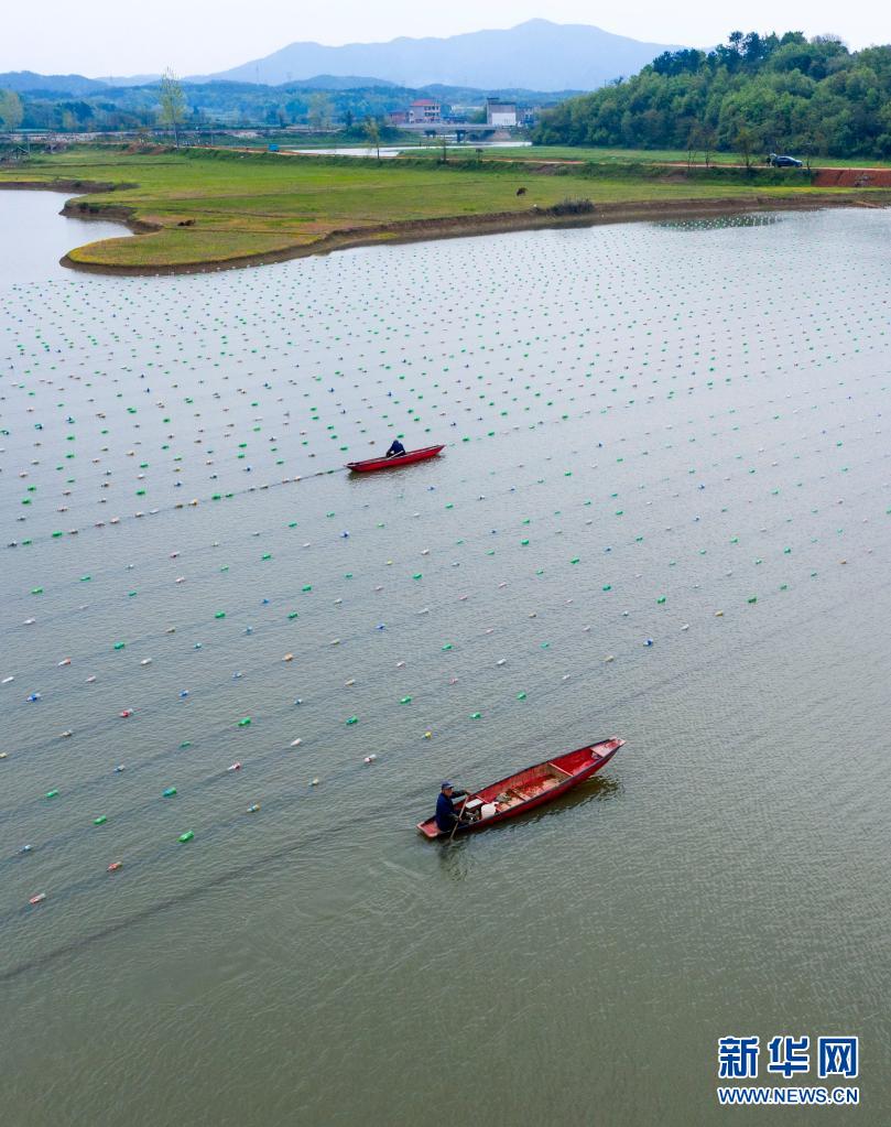 4月6日,在江西省九江市都昌縣新妙湖畔珍珠養(yǎng)殖基地,蚌農在投放珍珠蚌(無人機照片)。