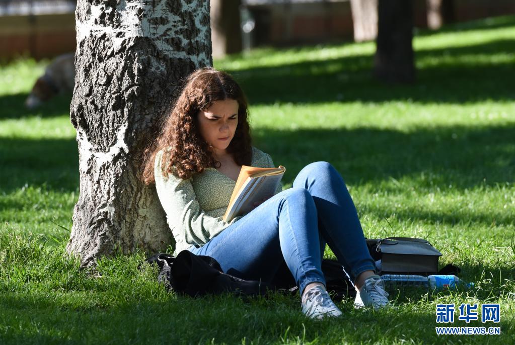 4月16日,一名女子在西班牙馬德里一個公園內(nèi)讀書。