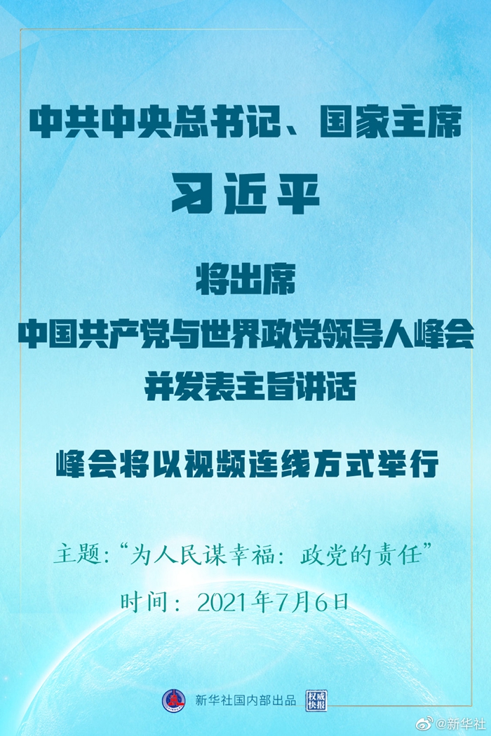 中共中央對外聯(lián)絡(luò)部發(fā)言人胡兆明5日宣布,中國共產(chǎn)黨與世界政黨領(lǐng)導(dǎo)人峰會(huì)將于7月6日以視頻連線方式舉行,中共中央總書記、國家主席習(xí)近平將在北京出席會(huì)議并發(fā)表主旨講話。此次會(huì)議的主題為“為人民謀幸福:政黨的責(zé)任”,160多個(gè)國家的500多位政黨和政治組織等領(lǐng)導(dǎo)人以及逾萬名政黨代表等將出席會(huì)議。