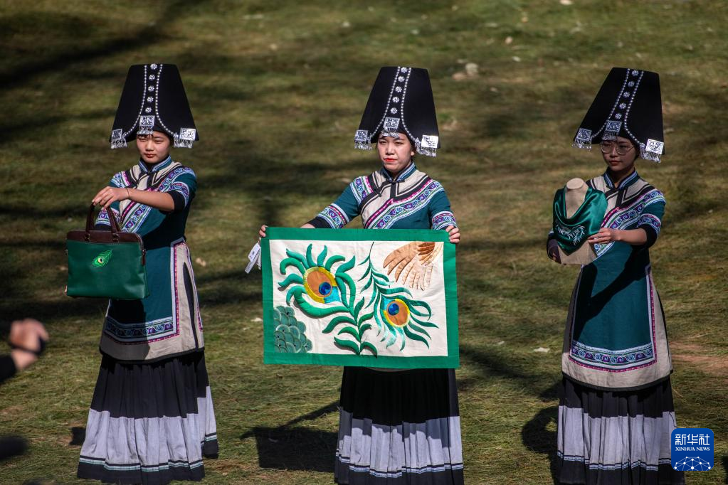 2月5日,村民在赛装节上展示彝绣文创产品。