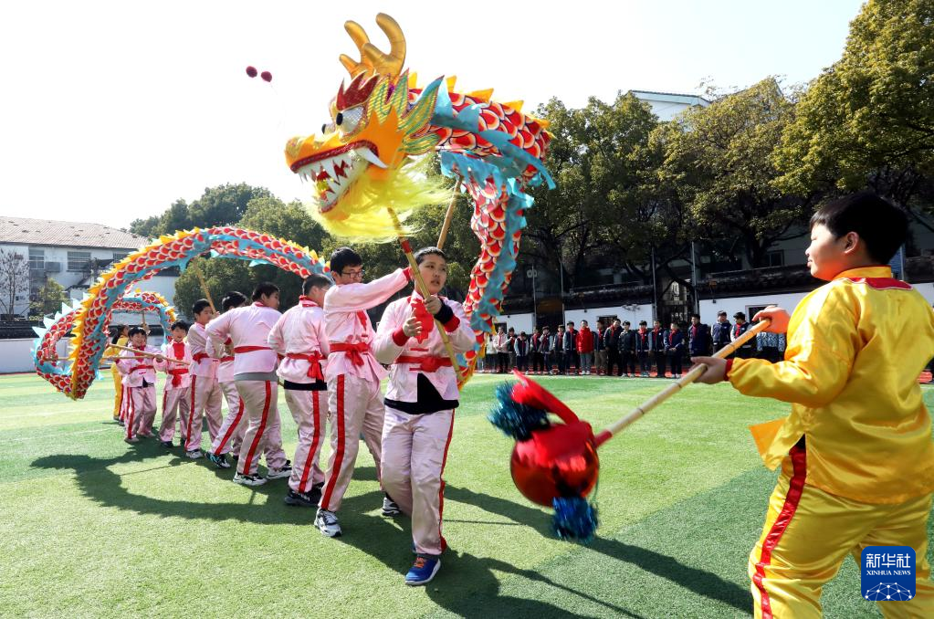 2月20日,江苏省苏州市昇平实验小学校学生表演舞龙,迎接“二月二”。