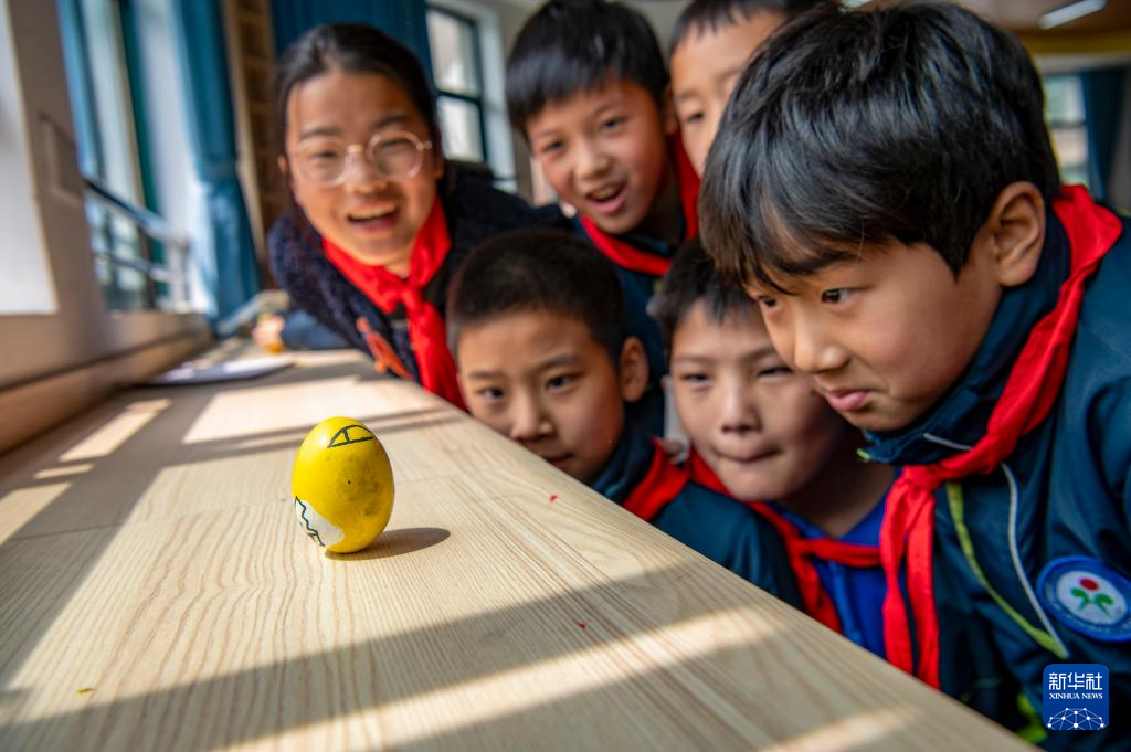 3月20日,在湖南省资兴市第一完全小学,孩子们在玩“立蛋”游戏。
