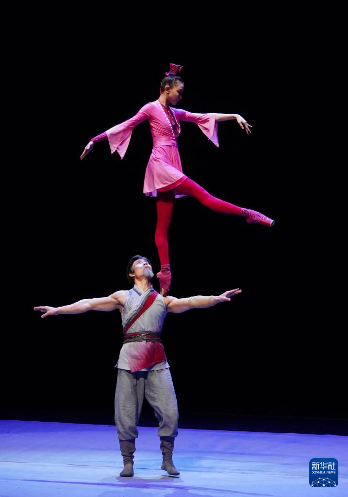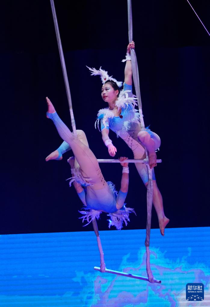 3月21日,在位于山东省济南市的山东省会大剧院,演员表演杂技节目《双人吊子》。