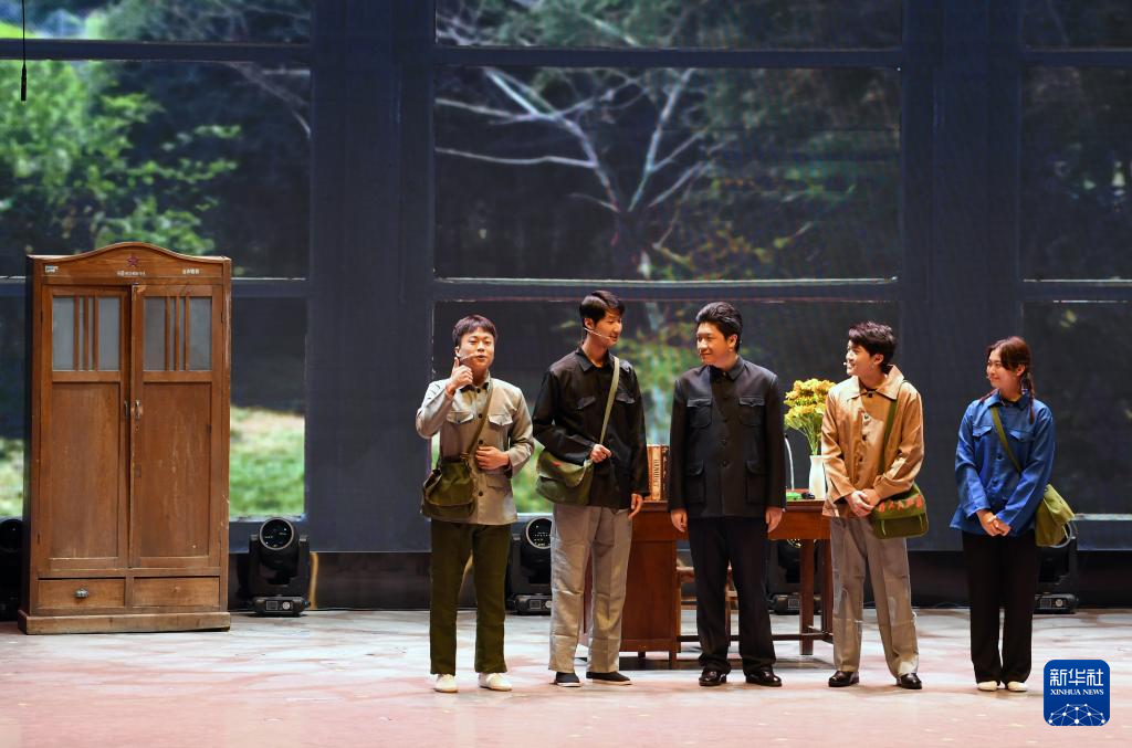 4月1日,北京交通大学学生在舞台上表演话剧《中国机车先驱》。