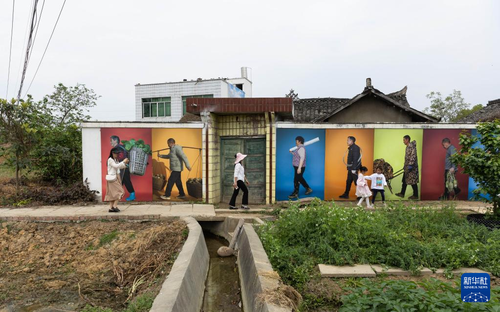 这是在宝胜村村屋墙壁上展出的影像艺术作品(4月1日摄,无人机照片)。