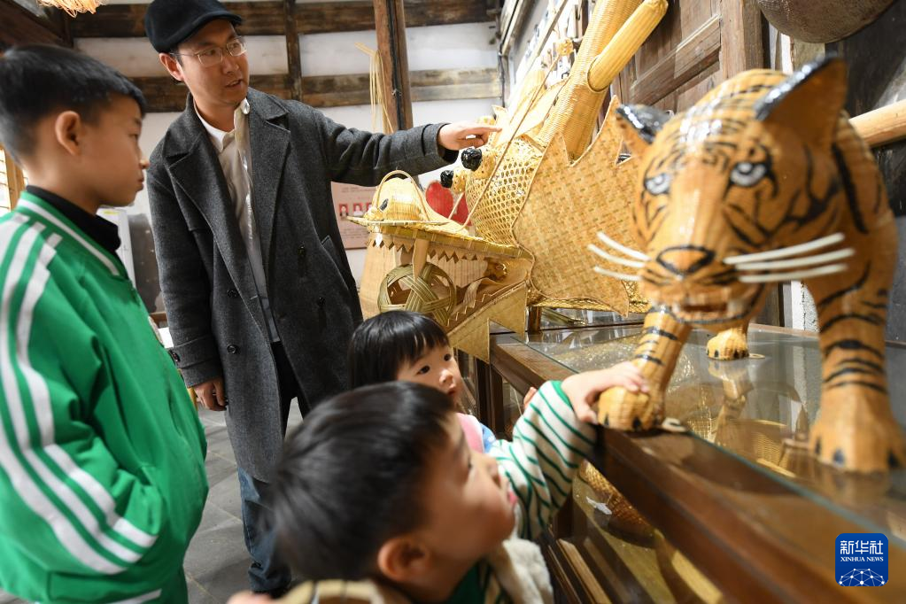 4月3日,姜鹏给前来参观的儿童介绍竹编龙头的机关。
