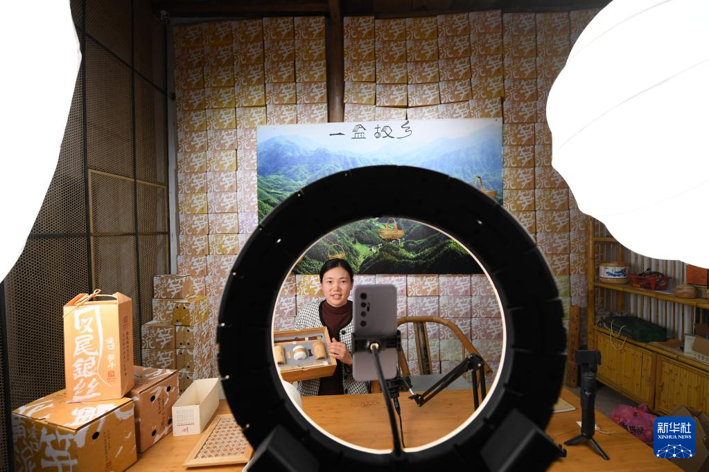 4月3日,邹霞在直播间介绍一款由当地黄茶、红木筷子、皮纸和手工竹编结合的产品。