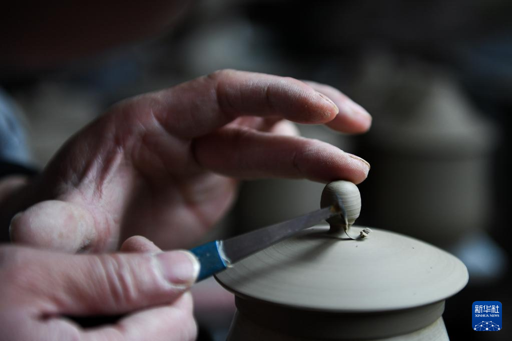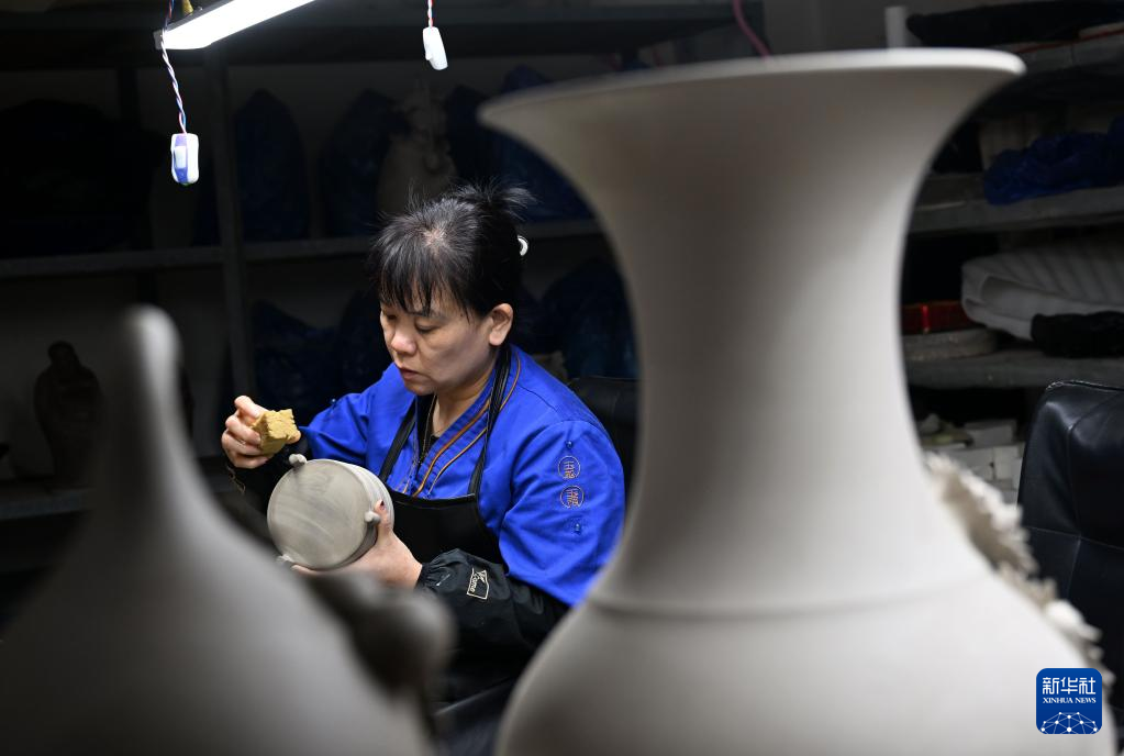 4月14日,在河南省汝州市一家汝瓷生产车间内,工人在修坯。