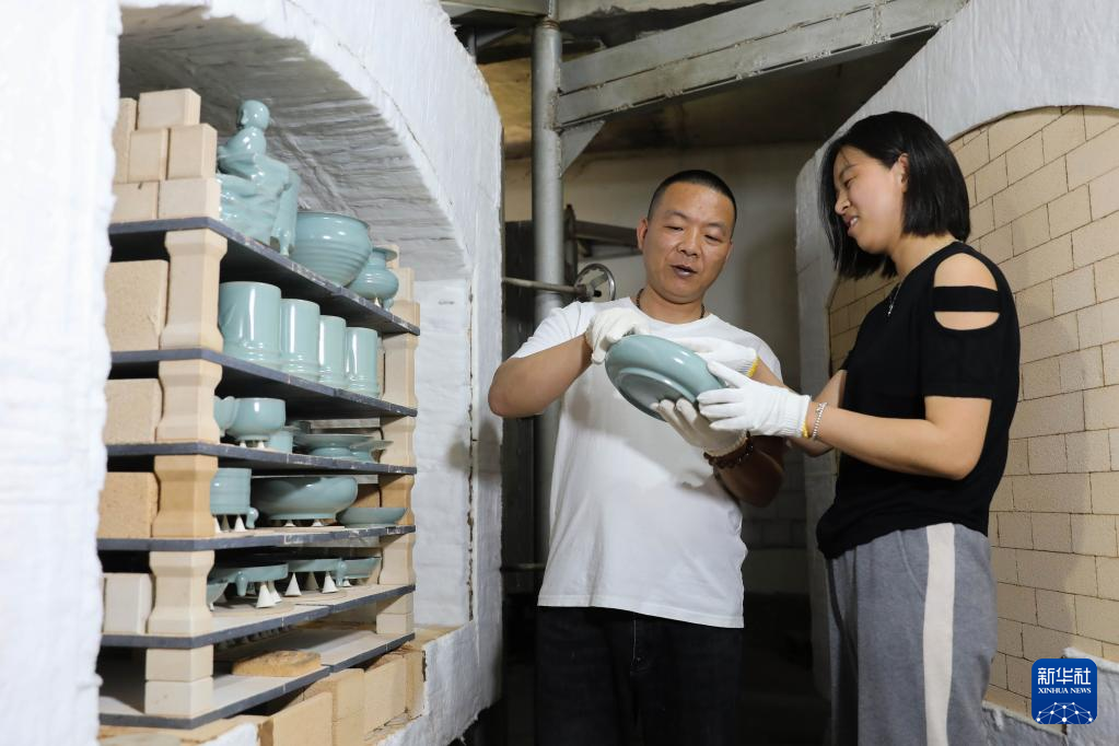 4月19日,在宝丰县一家汝瓷作坊,汝瓷艺人宋召冰(左)与家人查看汝瓷成品质量。