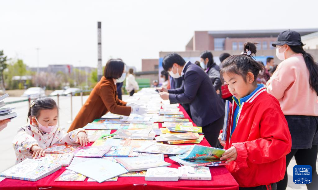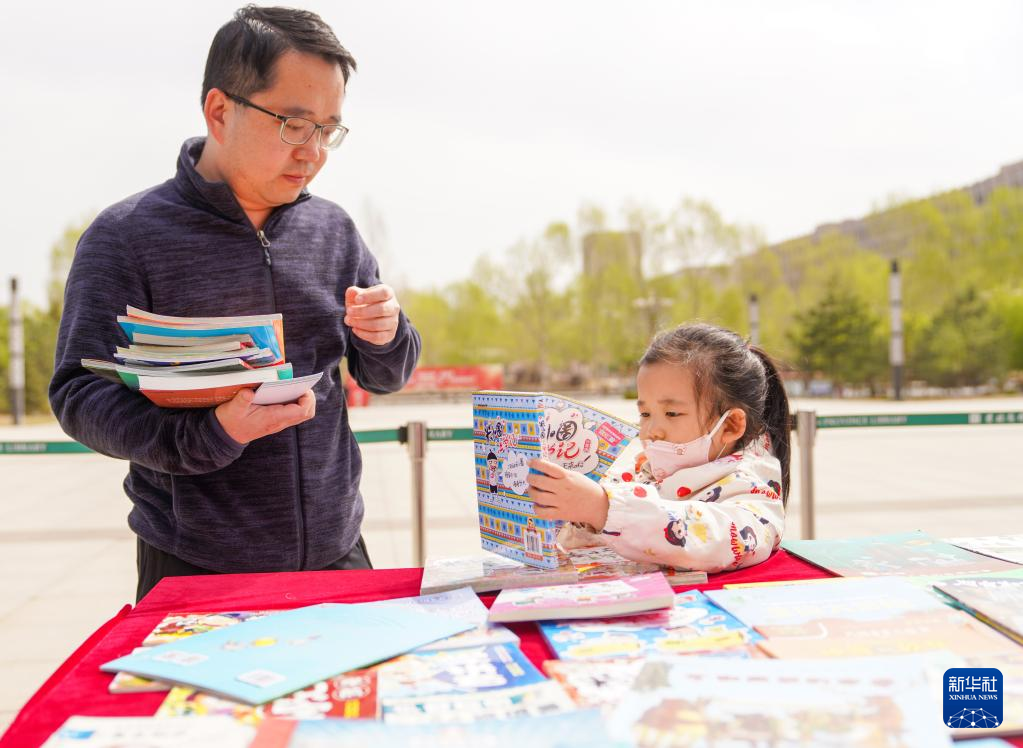 4月22日,一名小朋友在吉林省图书馆前的“换书大集”挑选图书。