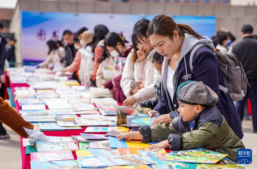 4月22日,市民在吉林省图书馆前的“换书大集”挑选图书。