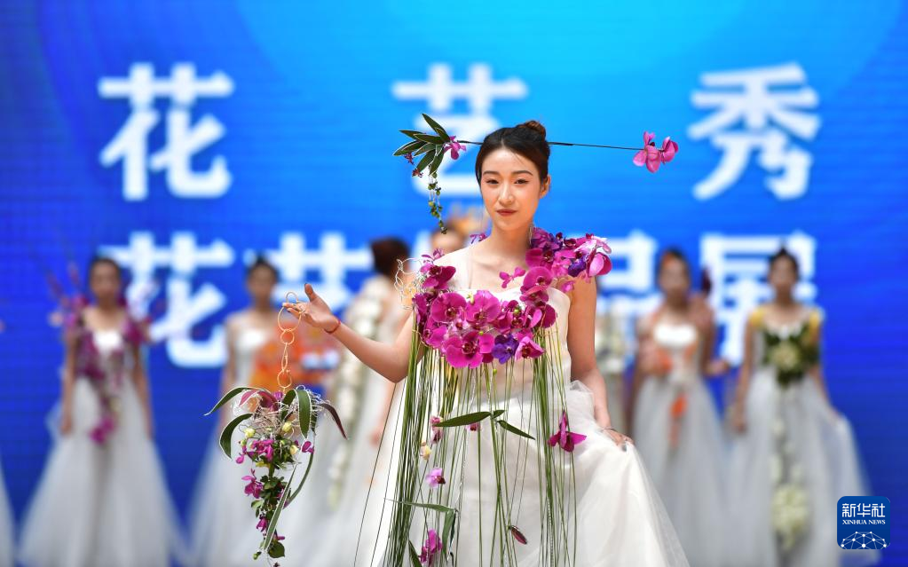5月10日,辽宁农业职业技术学院学生进行花艺秀展示。