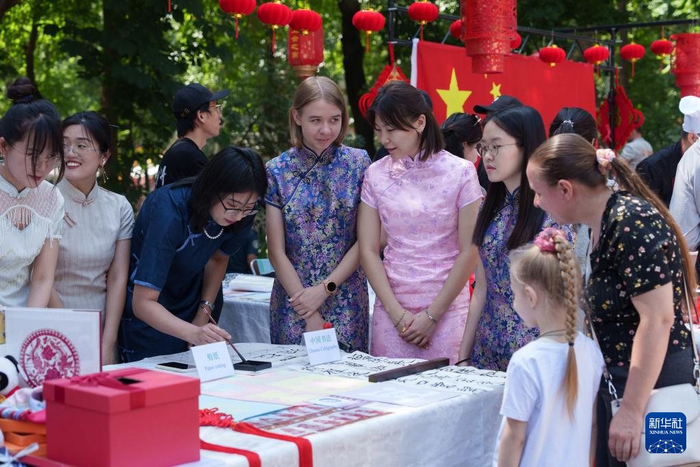 5月27日,人们在乌兹别克斯坦首都塔什干的中央公园体验中国书法。