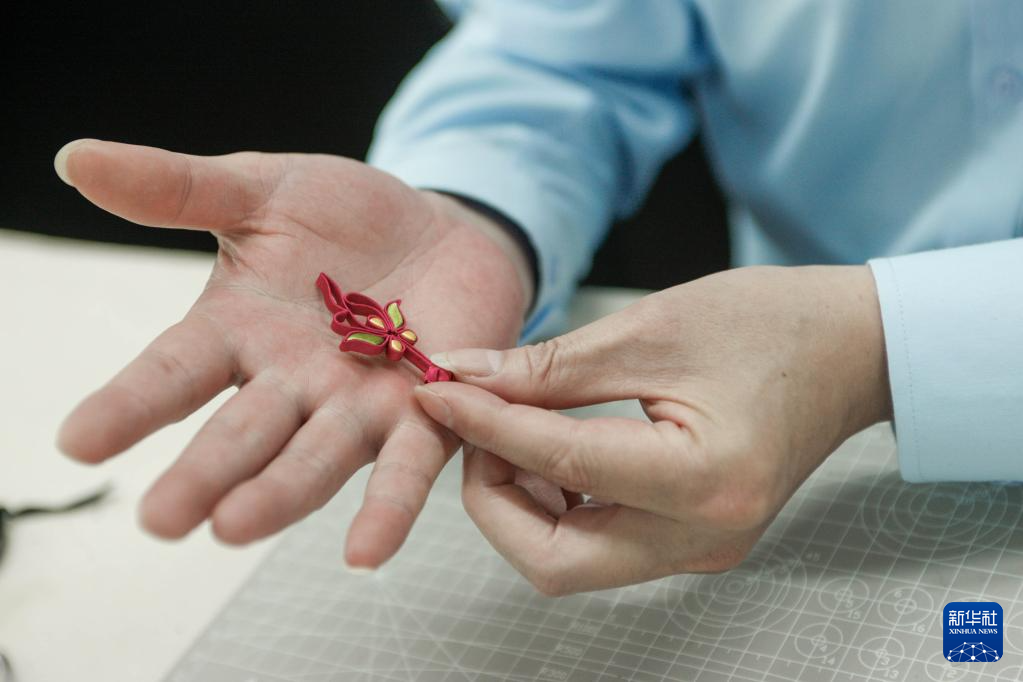 5月31日,江满宗在上海市“龙凤旗袍制作技艺——国家级非物质文化遗产传习所”展示盘扣。