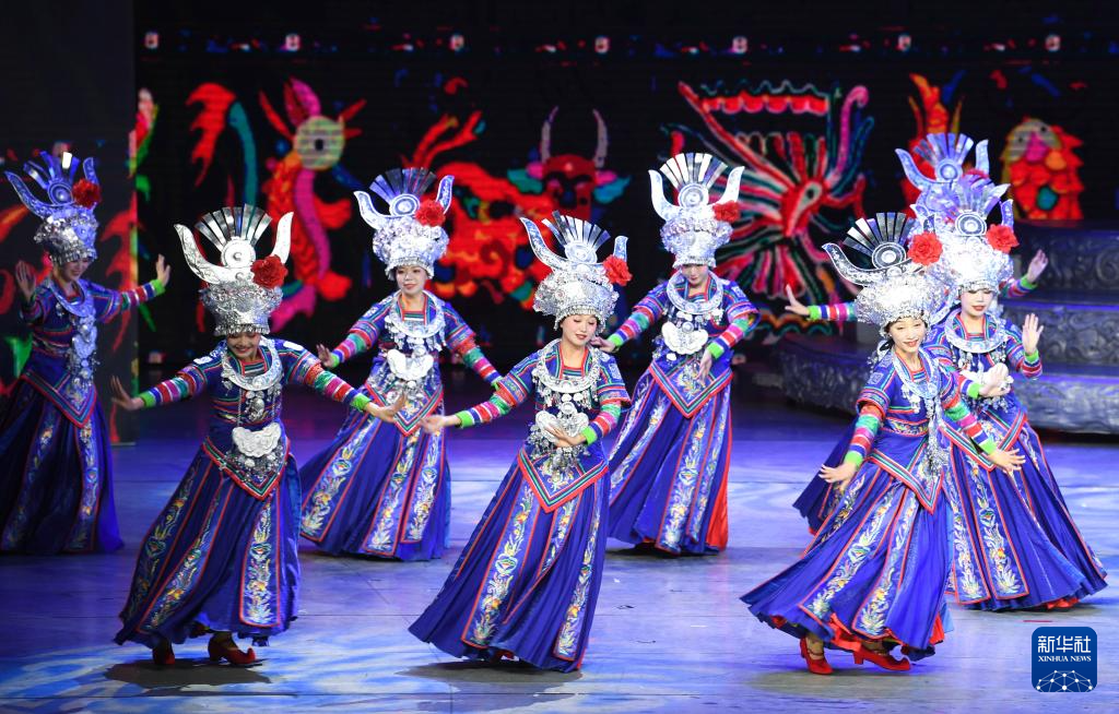 6月5日,演员在贵阳大剧院的《多彩贵州风》演出中表演节目《金绣银饰》。