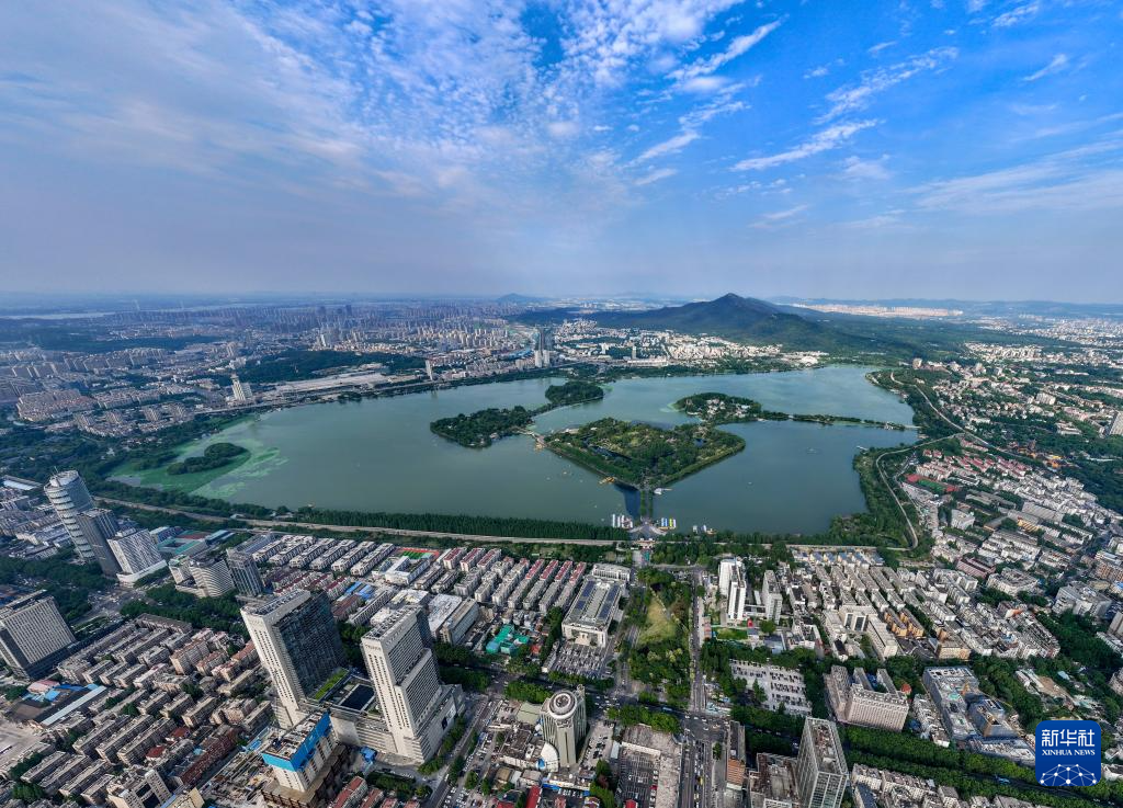 南京明城墙神策门、玄武湖与城市风光(6月9日摄,无人机照片)。