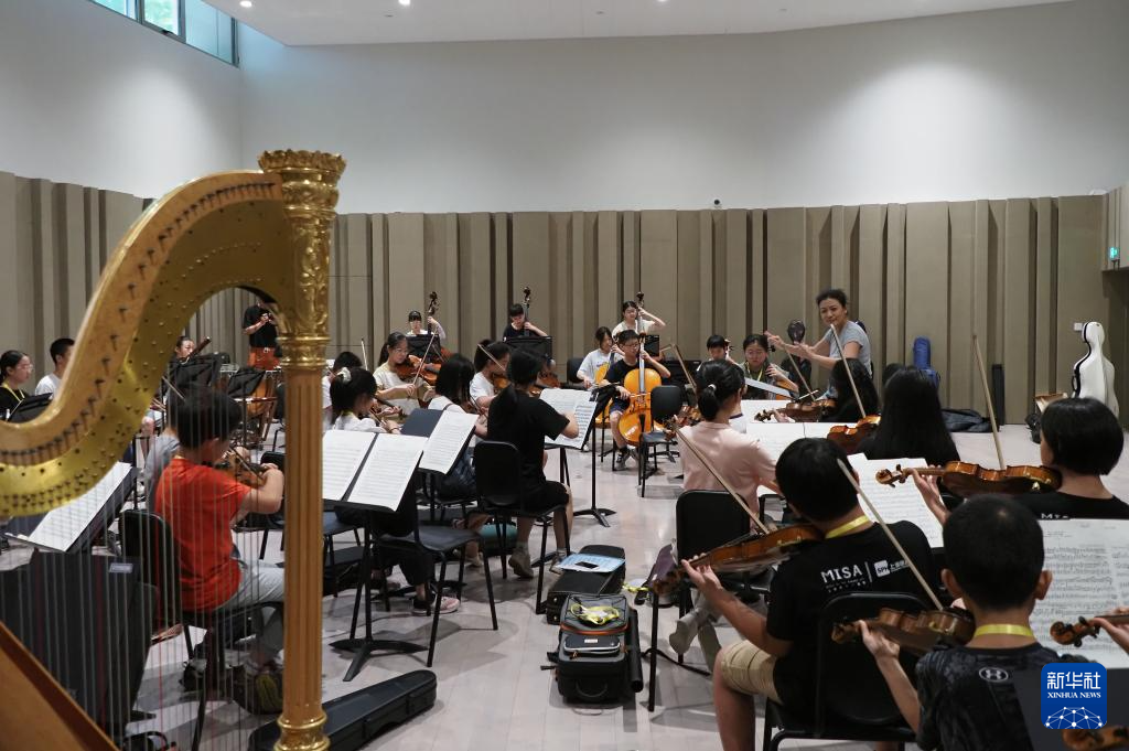 7月11日,“MISA学生节日乐团”弦乐声部的学生在进行首次联排。