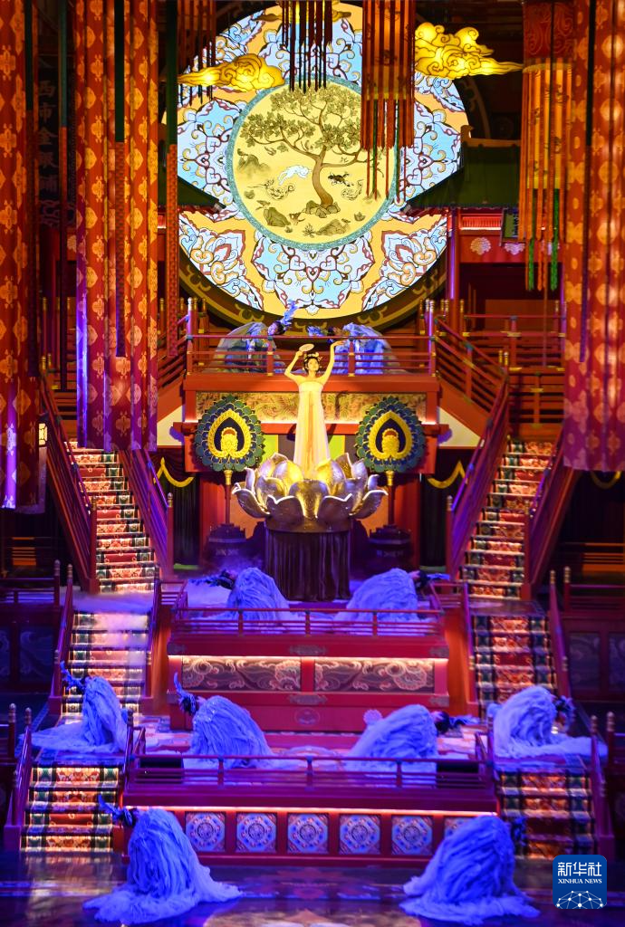 8月2日,唐风演艺《霓裳羽衣舞》的演员在长安十二时辰主题街区表演。