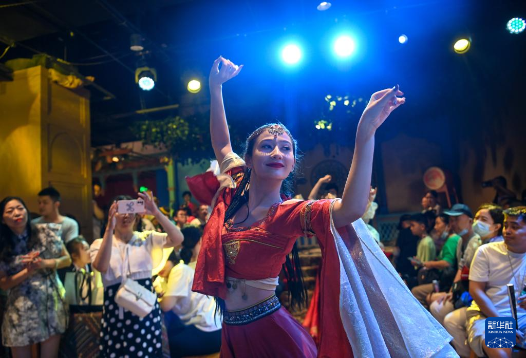 8月2日,游客在长安十二时辰主题街区观看唐风演艺《胡姬酒肆》。