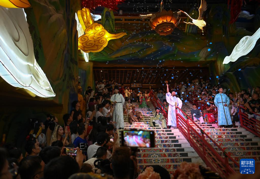 8月2日,游客在长安十二时辰主题街区观看唐风演艺《将进酒》。
