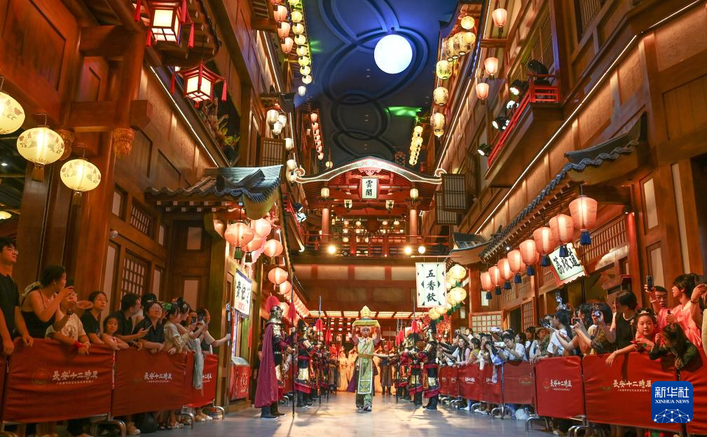 8月2日,游客在长安十二时辰主题街区观看唐风演艺《大唐曲艺》。