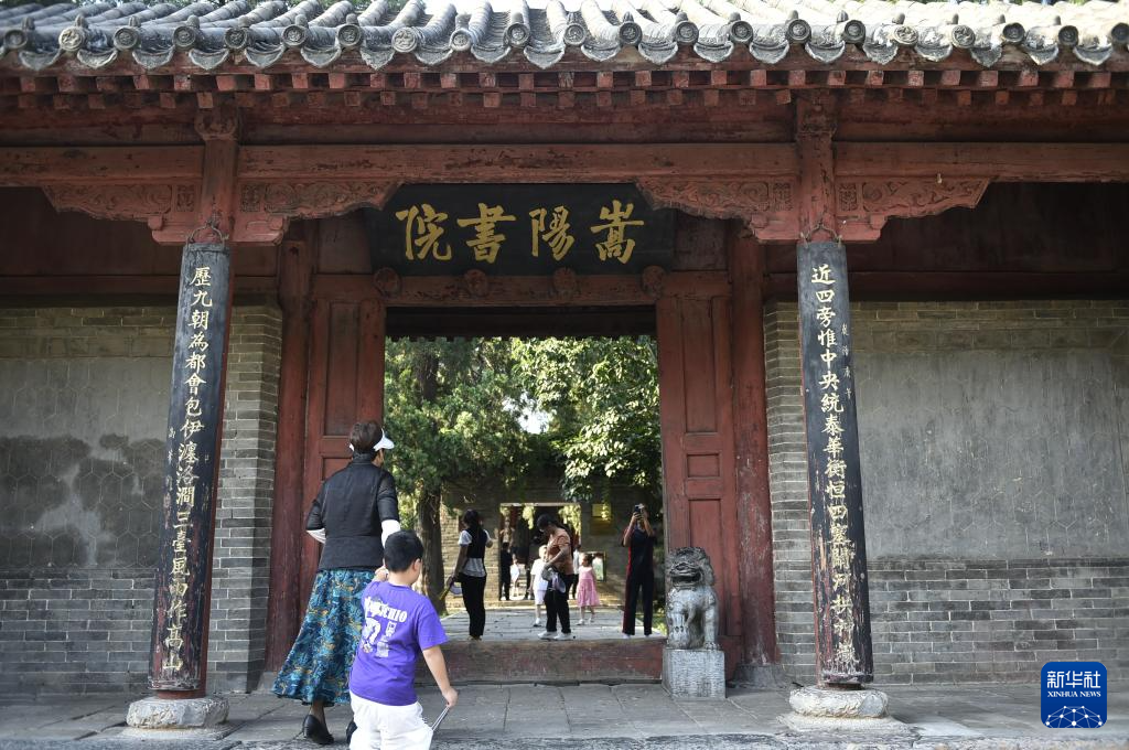 8月7日,游人在嵩阳书院内的“杏坛”参观。