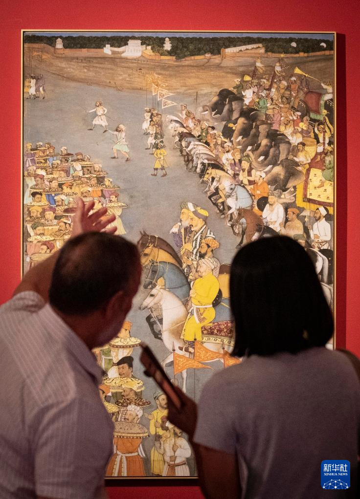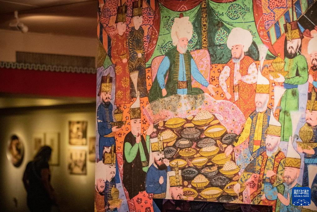 8月24日,在耶路撒冷举行的古代阿拉伯世界饮食文化展上,人们观看描绘婚宴场景的绘画。