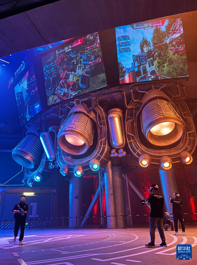 9月5日,在服贸会首钢园区首钢一高炉SoReal元宇宙乐园内,游戏玩家向观众展示VR竞技游戏。