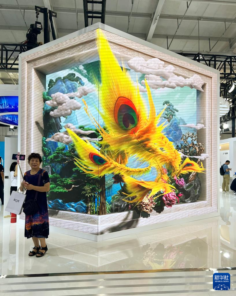 9月5日,在服贸会首钢园区电信、计算机和信息服务专题展区京东方展台,观众在裸眼3D屏幕前自拍。