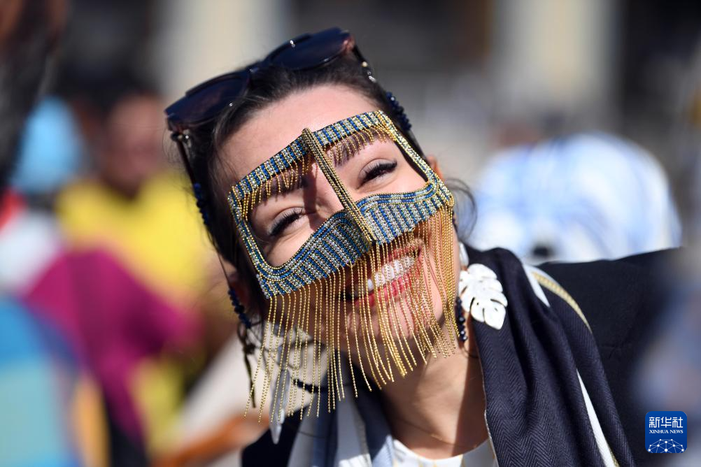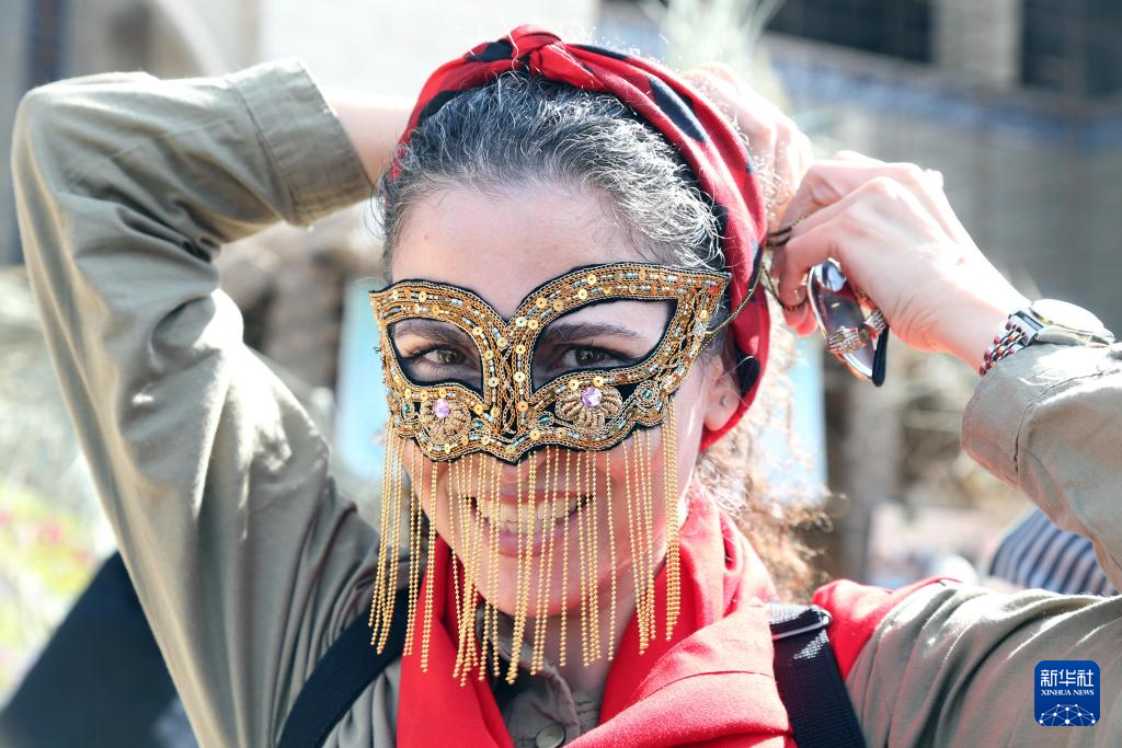10月10日,在伊朗首都德黑兰,一名女子试戴特色传统面具。