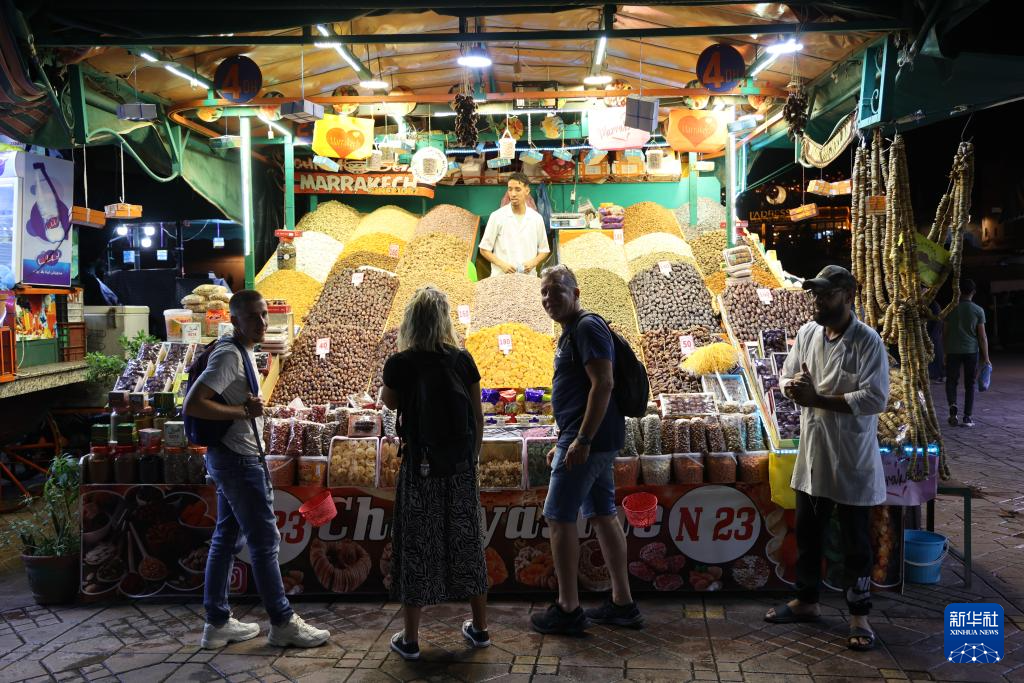 10月11日,游客在摩洛哥马拉喀什的干果摊前驻足。