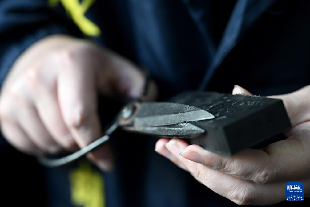 10月24日,在安徽省黄山市歙县老胡开文墨业有限公司,周健为压制好的墨修边。