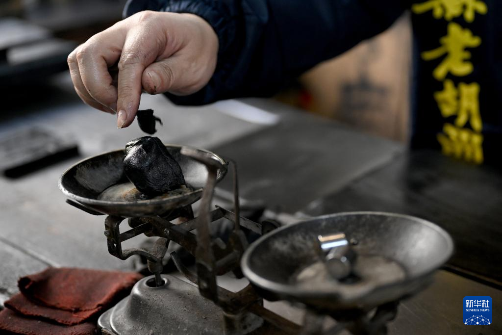 10月24日,在安徽省黄山市歙县老胡开文墨业有限公司,周健在称重墨块。