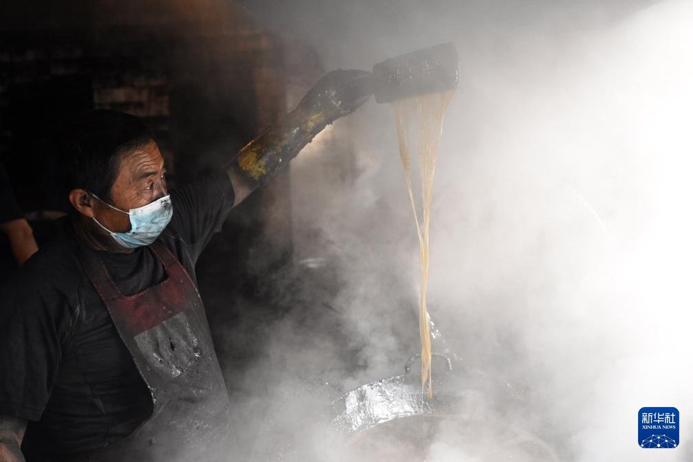 10月25日,在安徽省黄山市歙县老胡开文墨业有限公司,工人在熬胶。