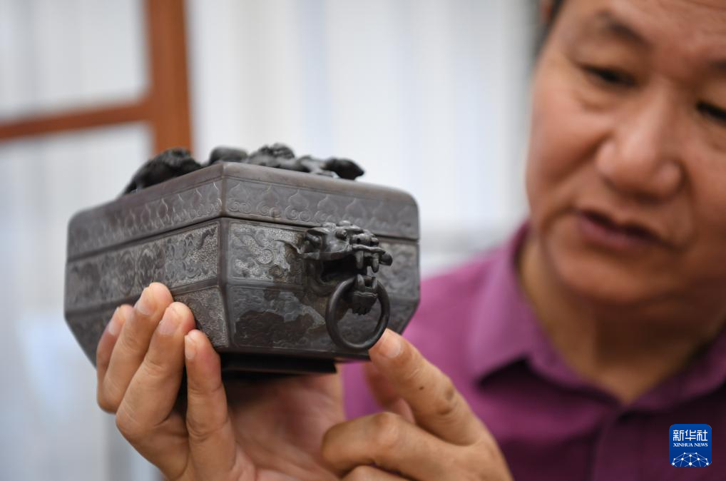 10月10日,在广东肇庆柳新祥端砚艺术馆,柳新祥讲解“仿西周·簠形双狮戏球套砚”的特点。
