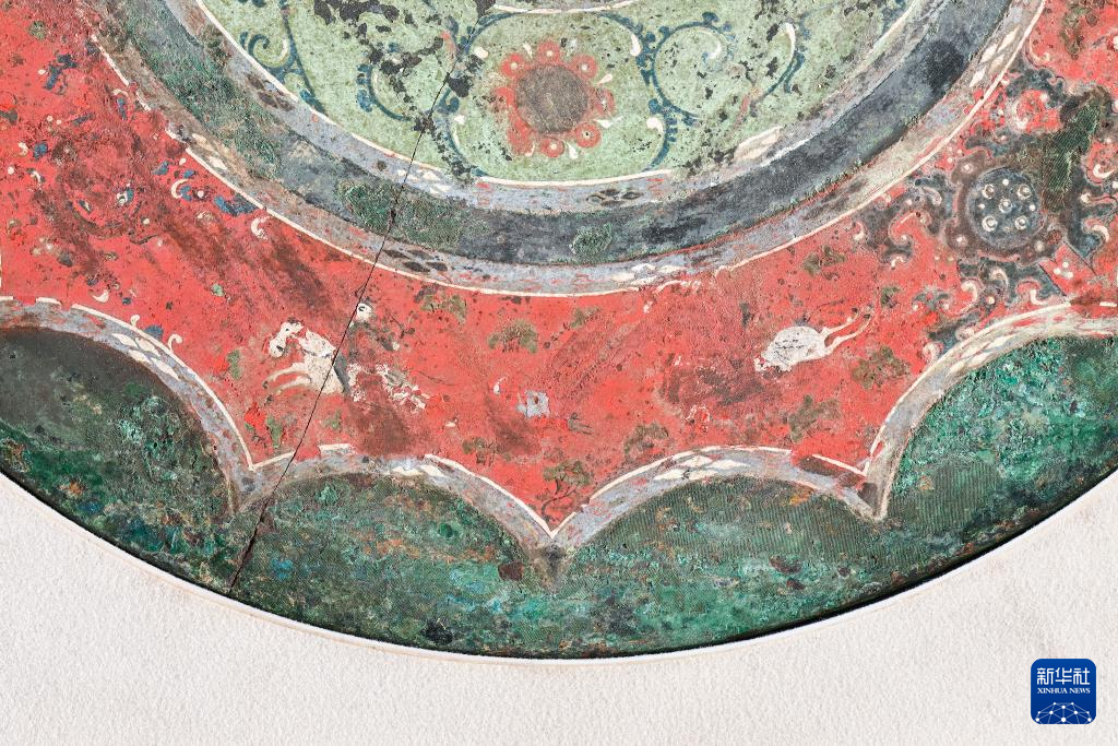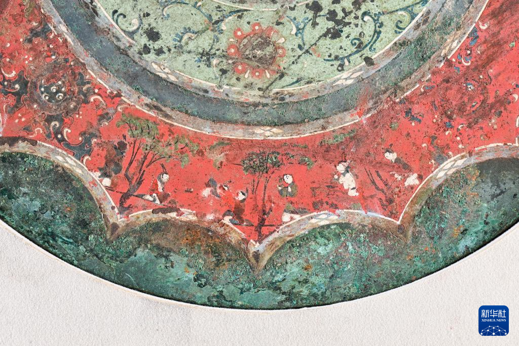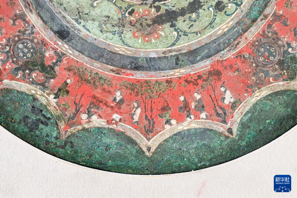 铜镜是古代妆容工具,具有重要的艺术和科学价值,彩绘铜镜是铜镜中的珍品。1963年在陕西西安红庙坡村出土的西汉彩绘人物车马镜,距今已有2000多年历史,色泽艳丽,精美绝伦,被视为中国古代彩绘铜镜代表作之一,入选国家文物局发布的《第三批禁止出境展览文物目录》。