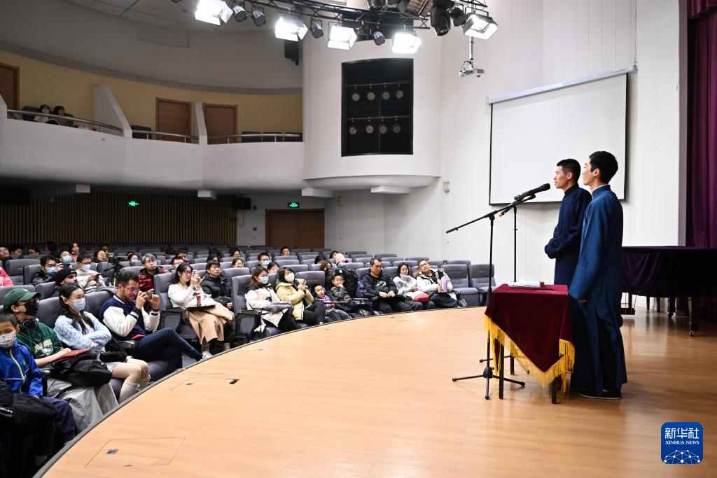 吴瑞龙(中前)和墨麒麟(中后)观看南开大学国乐相声协会的演出(12月3日摄)。