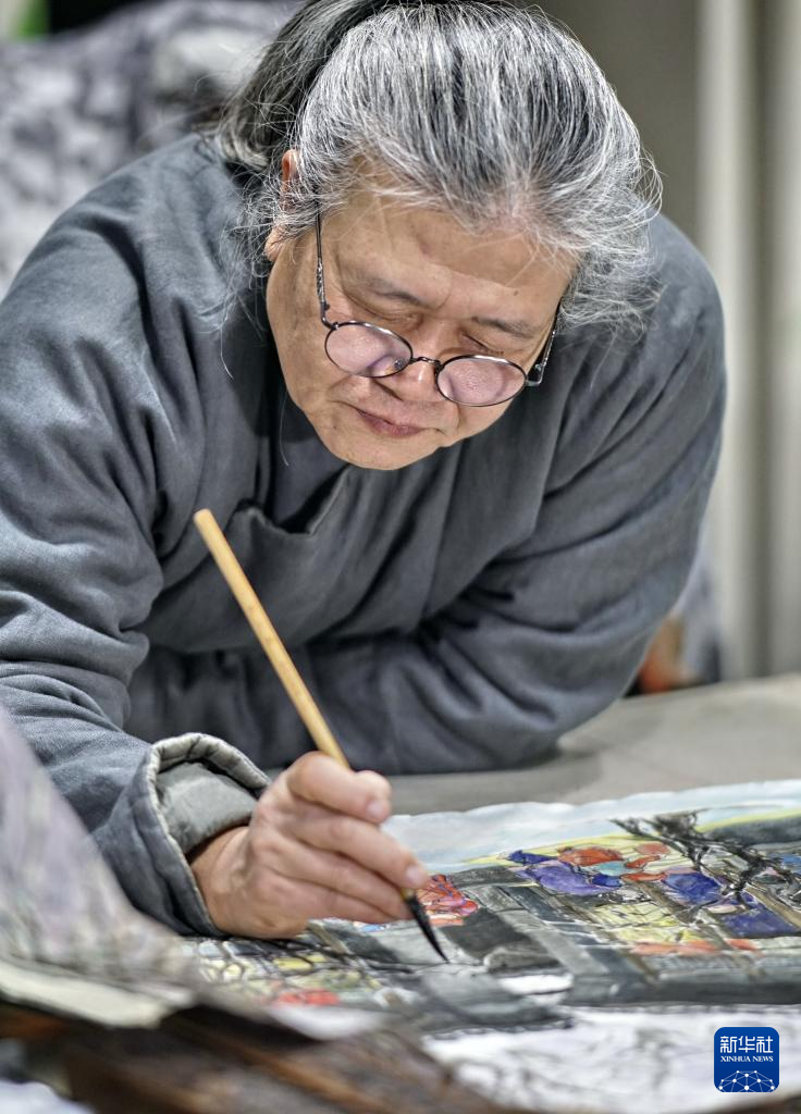 杨信在用传统绘画颜料进行创作(1月4日摄)。