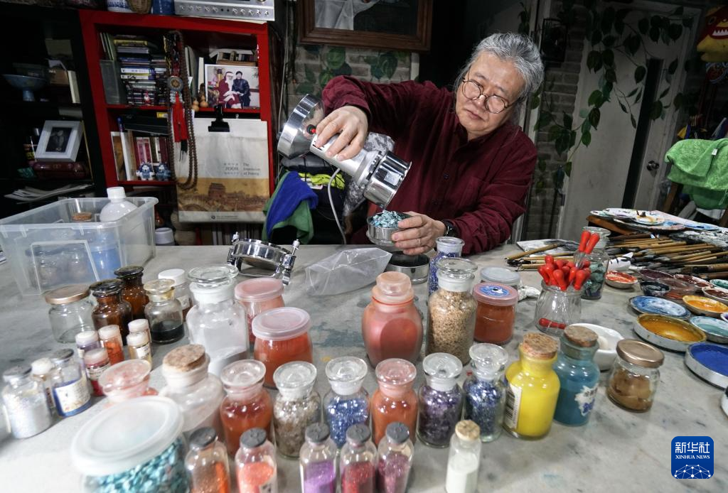 杨信用有色矿石磨制传统绘画颜料粉(1月4日摄)。