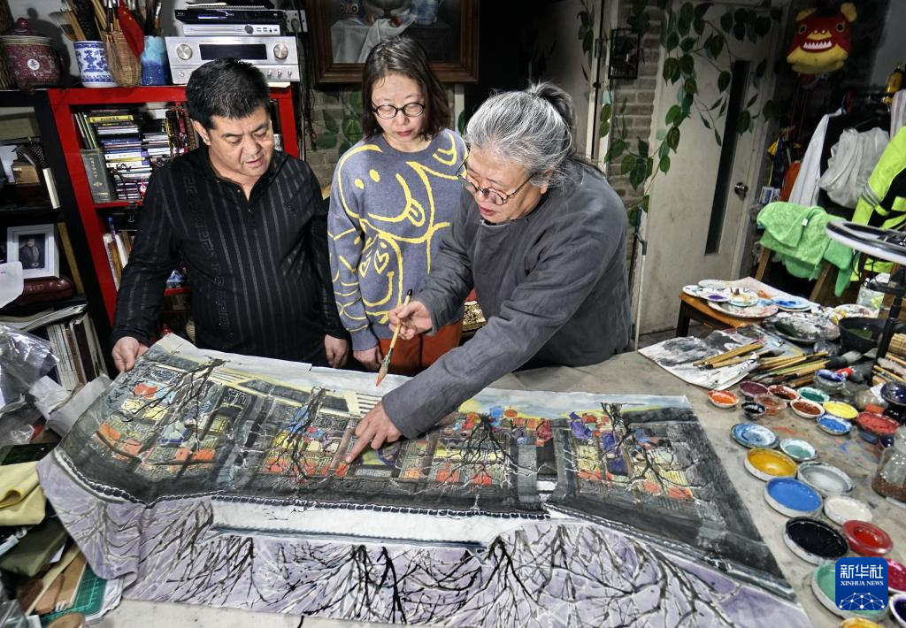 杨信(右)为来访的绘画爱好者介绍正在绘制的老北京风情作品(1月4日摄)。