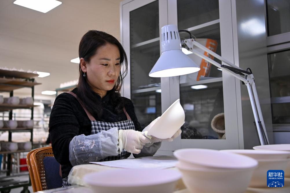 在位于山西省长治市上党区红绿彩村的生产基地内,工作人员在检查瓷器有无瑕疵(1月3日摄)。