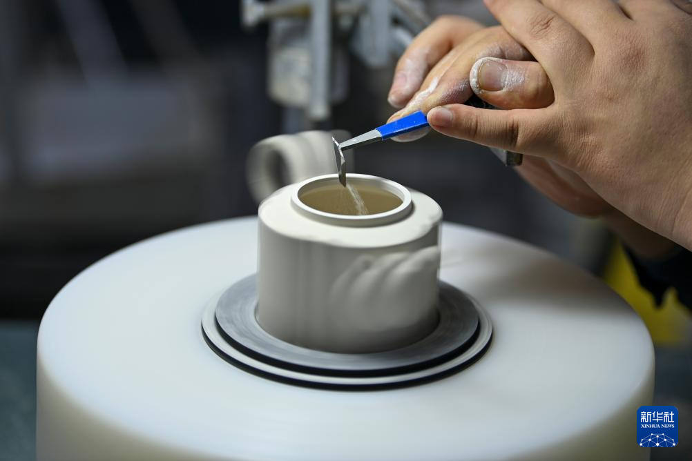 在位于山西省长治市上党区红绿彩村的生产基地内,工作人员在进行修坯(1月4日摄)。