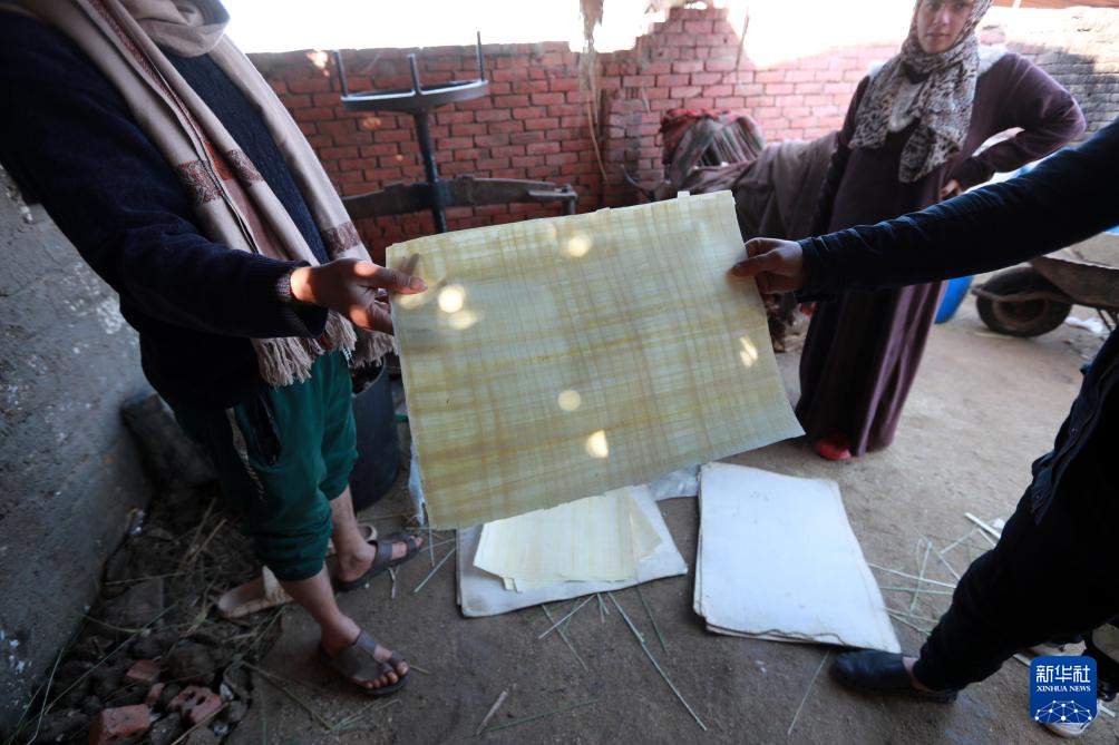 在卡拉姆斯村,记者看到纸莎草扎根泥潭,状如芦苇,表皮翠绿,茎秆挺直,其茎是制作纸莎草纸的唯一原料。在村民阿卜杜勒拉赫曼·赛义德的作坊内,人们先将收割的纸莎草根据纸张大小切割长茎,用勒紧的丝线去其表皮并将内瓤分割成薄片,后将薄片浸泡在特制水中让其变软变色;之后,将泡好的薄片横竖叠放成纸张形状,用布隔开并层层叠加成豆腐块状,再用机器压实,后将成形的纸张夹在纸板内并置于太阳下反复晾晒,最后成纸,其色淡黄,纹理分明。