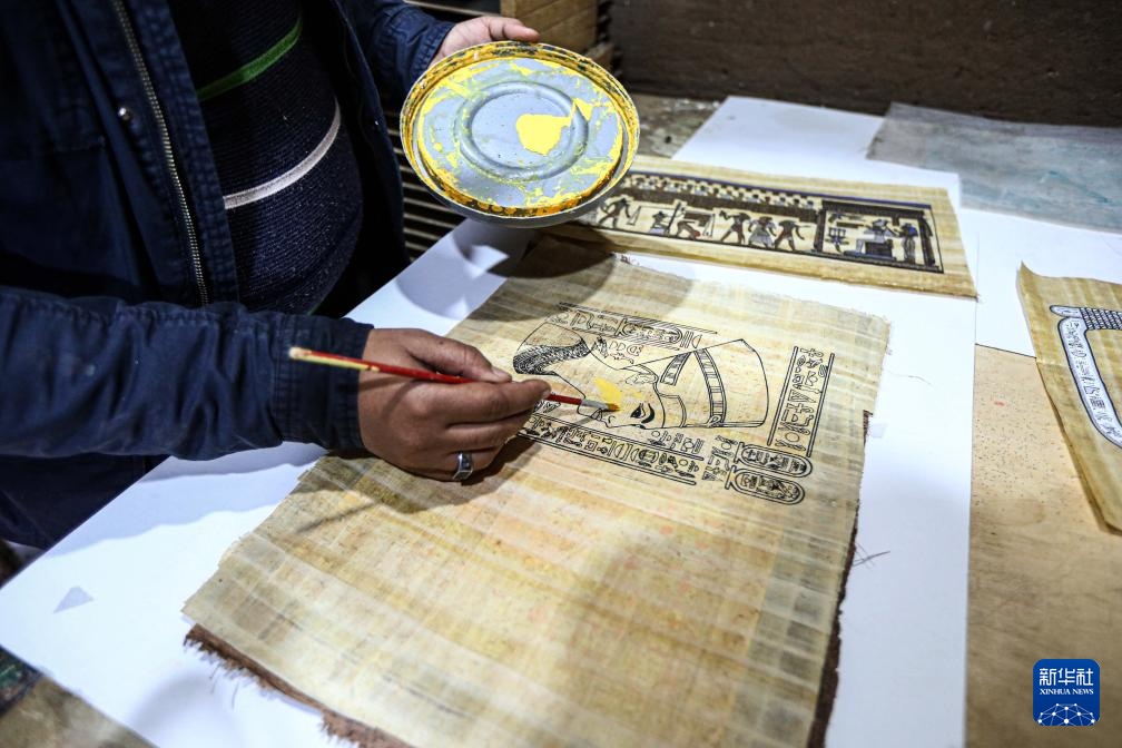 1月16日,在埃及东部省卡拉姆斯村,一名艺术家给用纸莎草纸制作的莎草画上色。