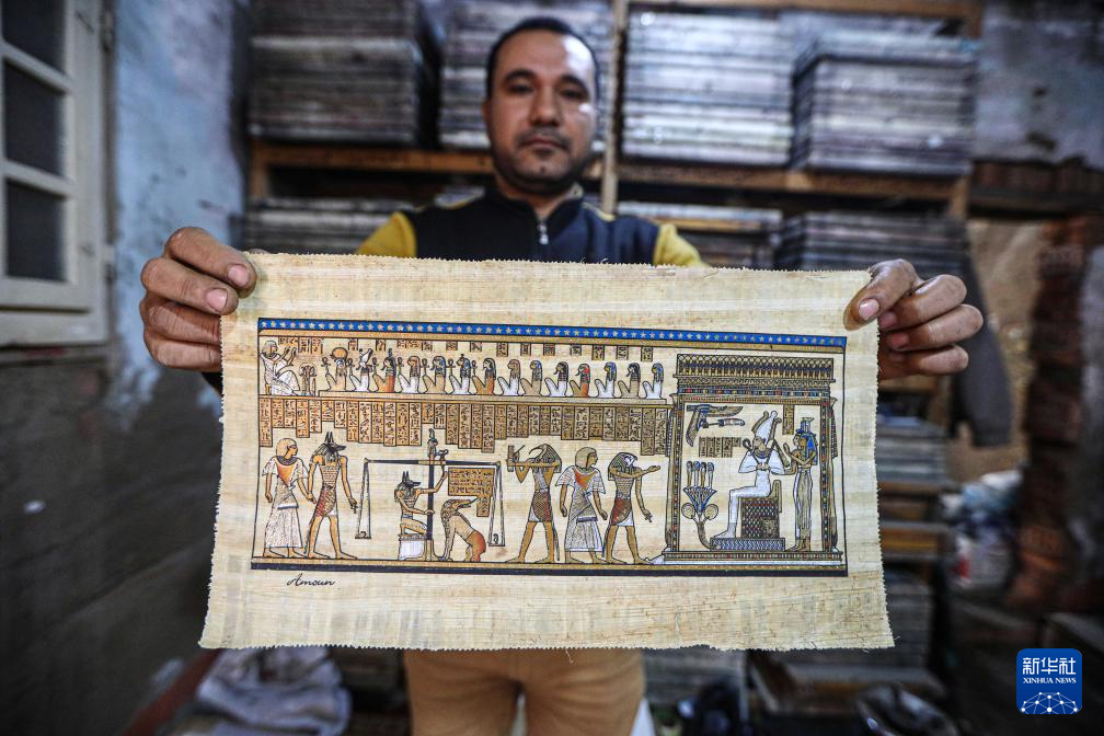 1月16日,在埃及东部省卡拉姆斯村,艺术家瓦格迪·穆罕默德展示用纸莎草纸制作的莎草画。