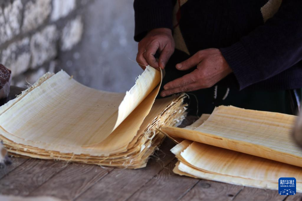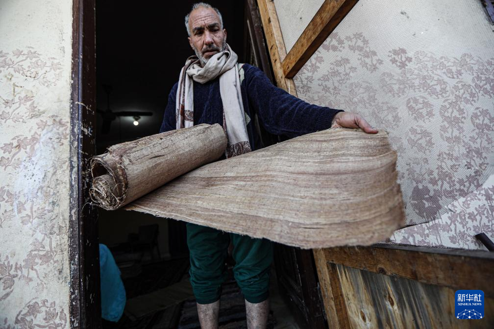 1月16日,在埃及东部省卡拉姆斯村,村民赛义德在自家的纸莎草纸制作作坊整理草纸。