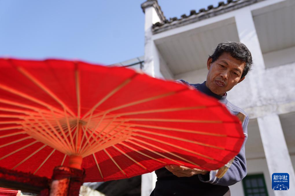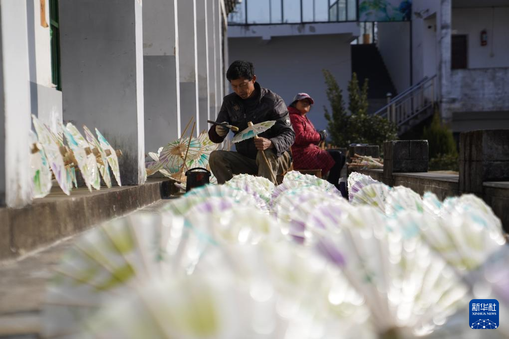 江西省婺源县赋春镇甲路村的工匠在甲路纸伞的伞骨上刷浆糊(1月11日摄)。