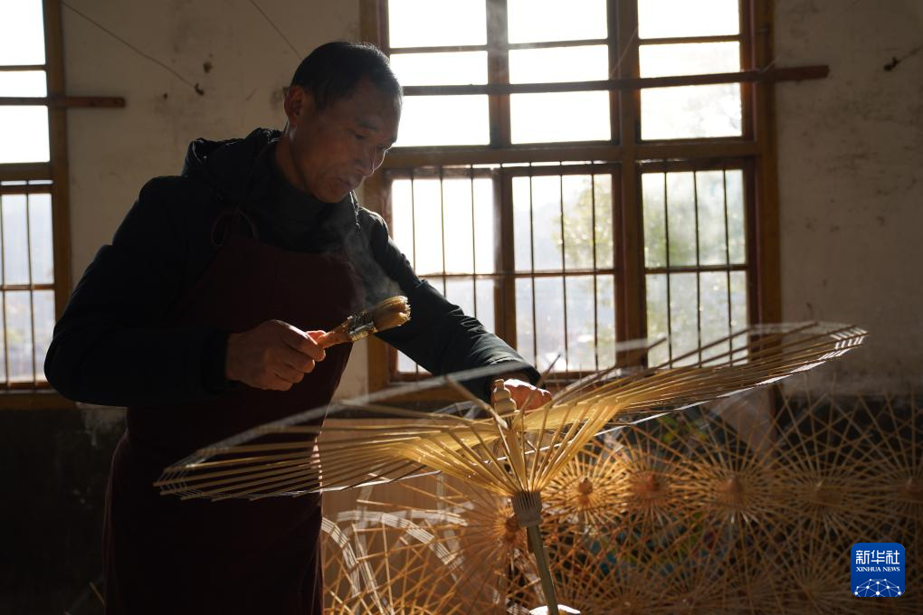 江西省婺源县赋春镇甲路村的工匠为甲路纸伞上桐油(1月11日摄)。