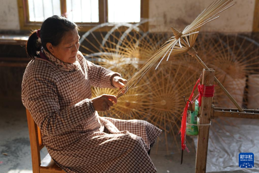 江西省婺源县赋春镇甲路村的工匠为甲路纸伞绕伞圈(1月11日摄)。